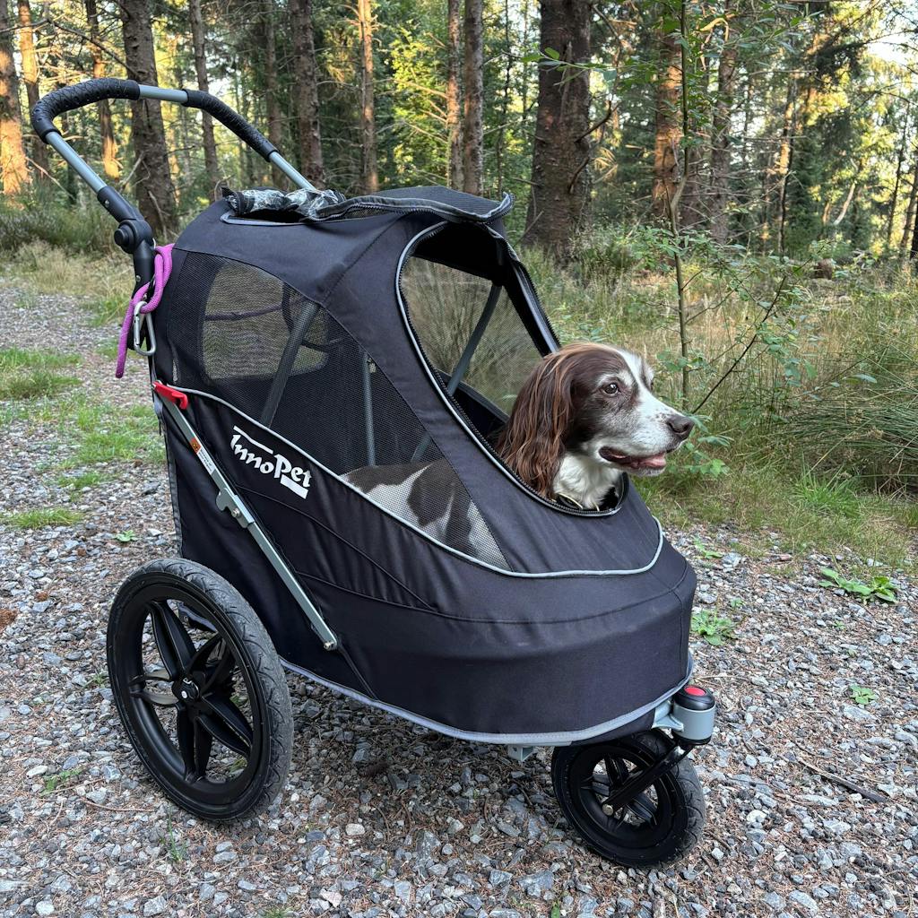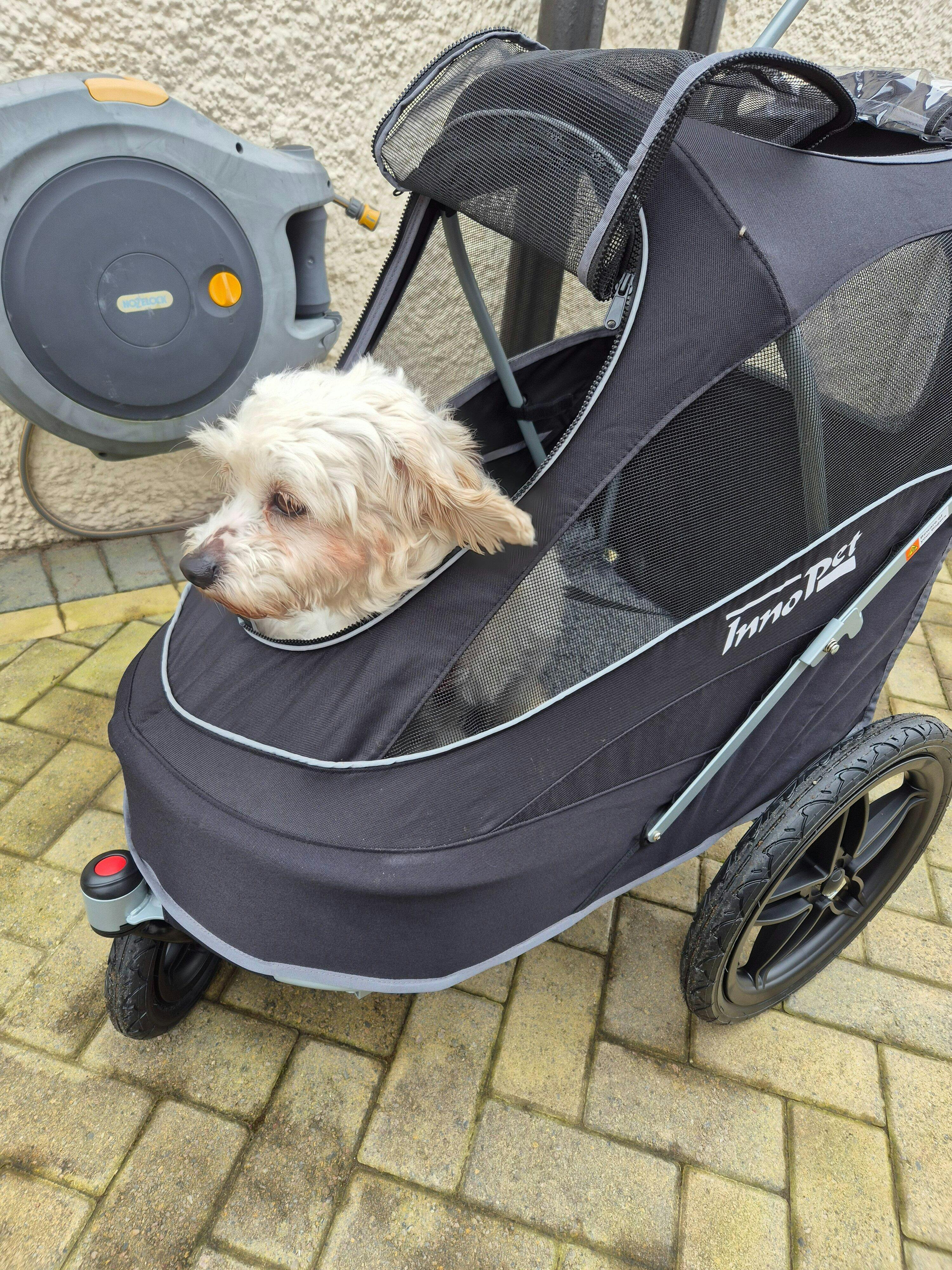We are absolutely delighted with our Innopet sporty stroller. It arrived very promptly in excellent packaging. It is really quick and easy to assemble and collapse and it's well designed and built. We are also impressed with how compact it is when folded. Our 14 year old Boarder Terrier is very happy with his wheels!