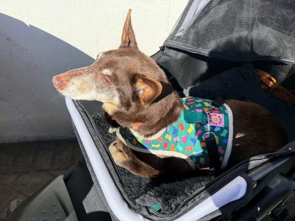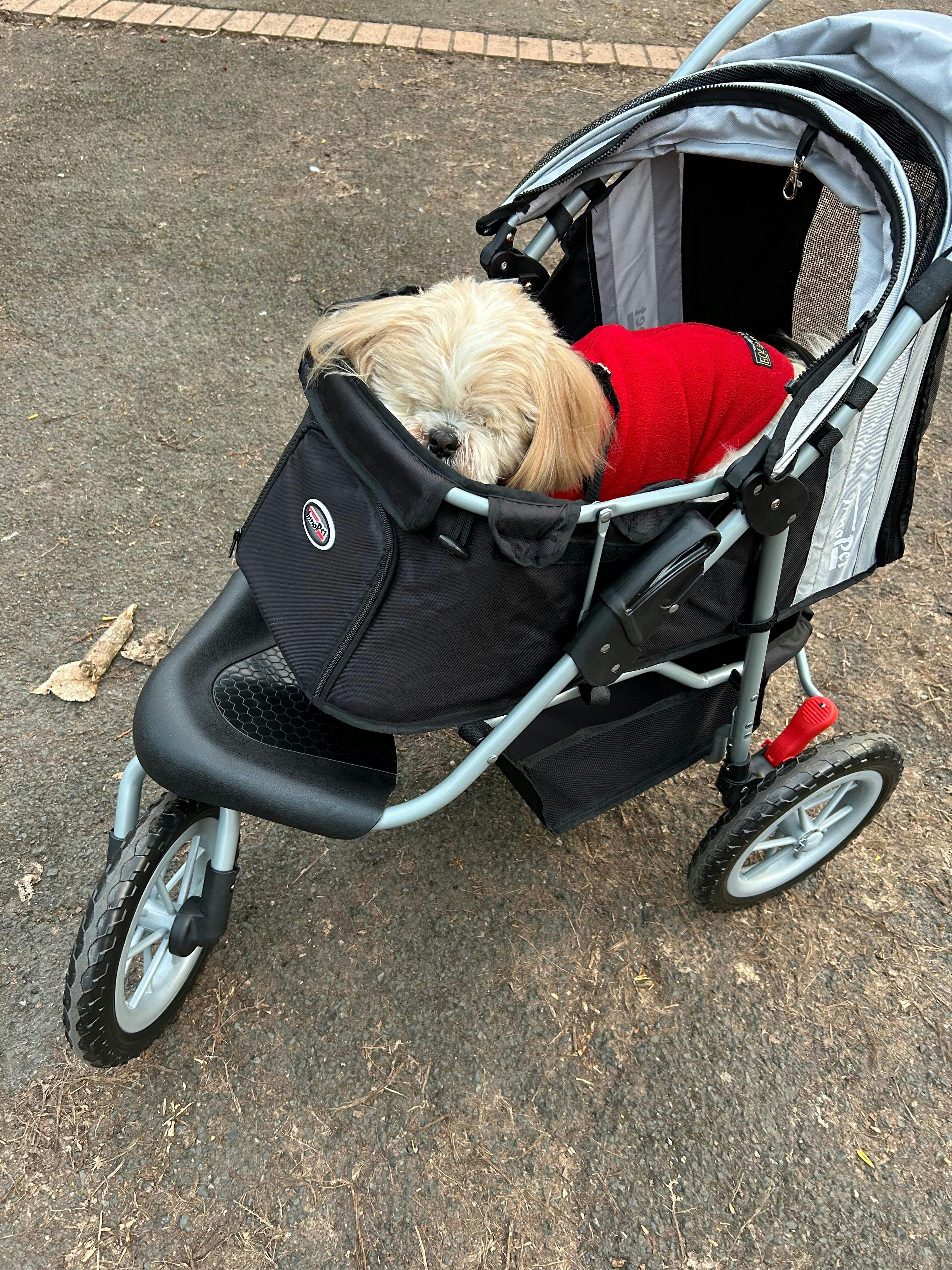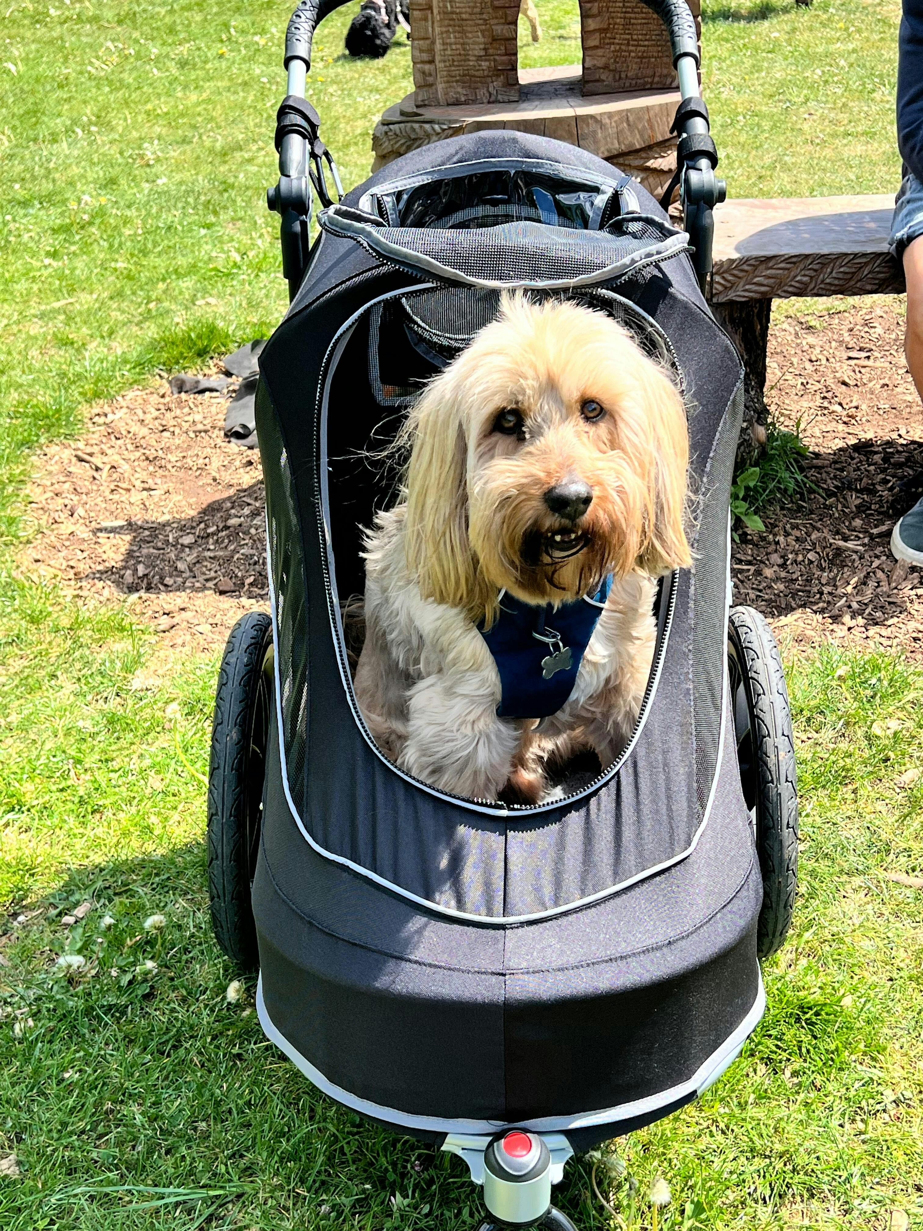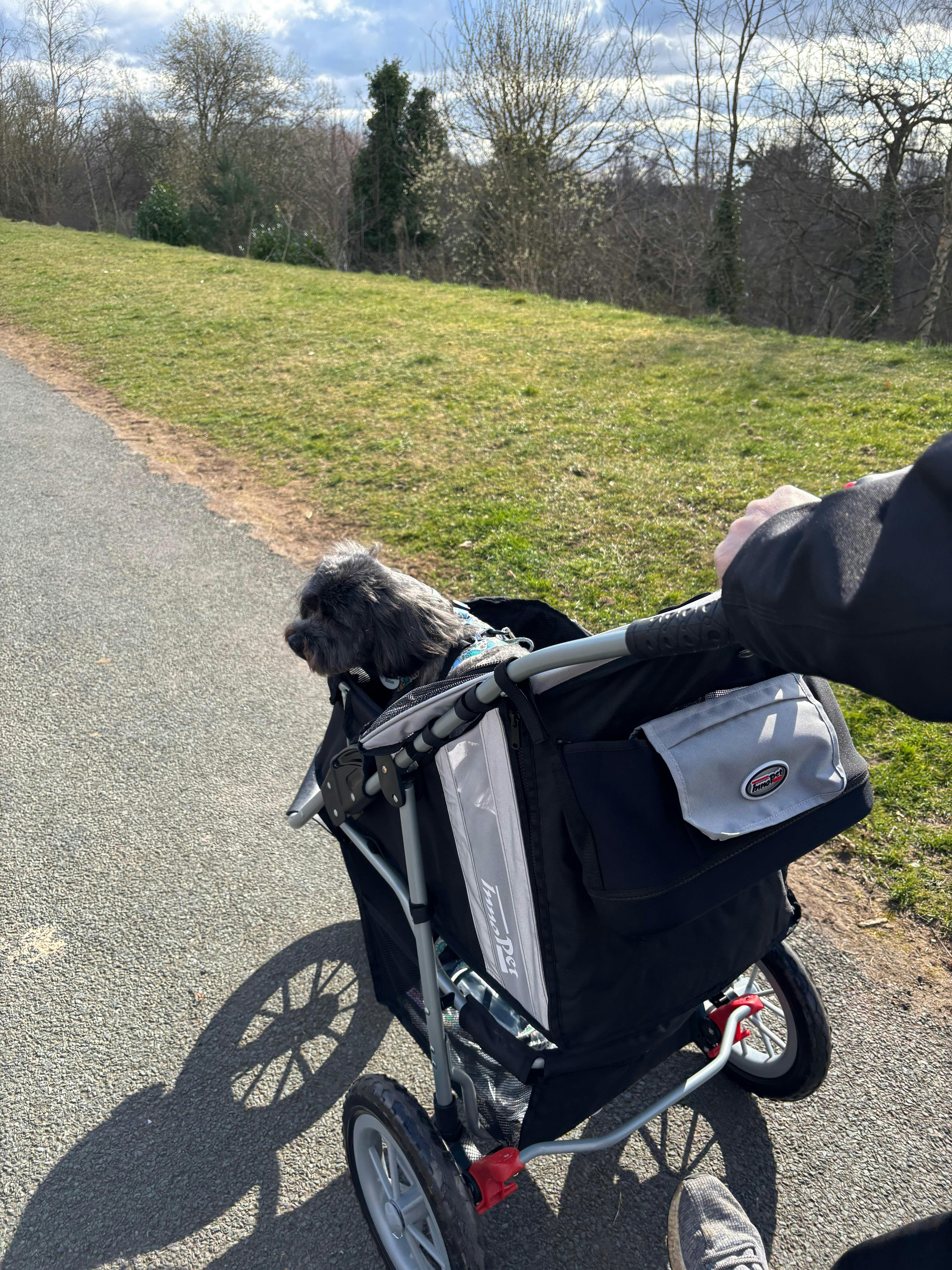 Our sweet girl has been blind for the past 5 years and now has arthritis. She is so determined, but we’ve found she can’t manage walks like she used to. We also have a 3 year old dog and it’s been really difficult to keep everyone happy. Having the stroller means Hetty can walk as far as she can, and be pushed when she’s had enough. It’s very easy to push with one hand when empty and lead her. I can see how much she is enjoying the smells and being outside when she is being pushed. I feel like we’ve got our girl back! She is a 13 kg Cairn Terrier and has plenty of room to stand or sit in the stroller. I think she could lie down, but it’s been too exciting so far! You can see more on Instagram @hettyandalbie