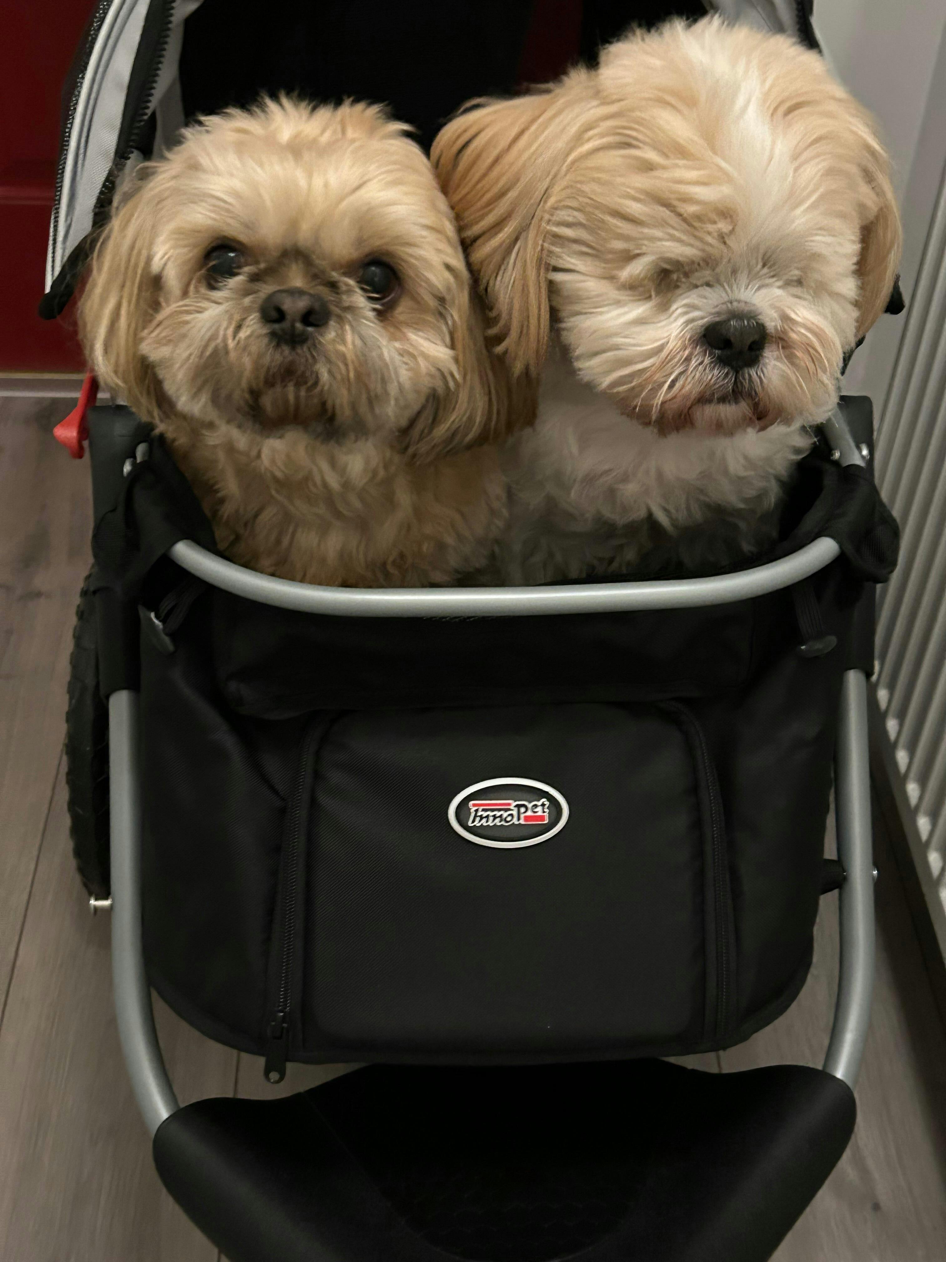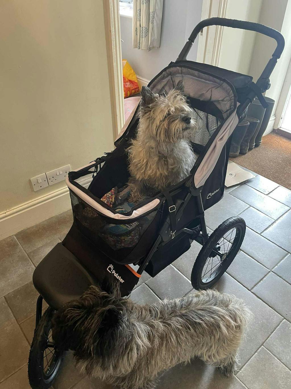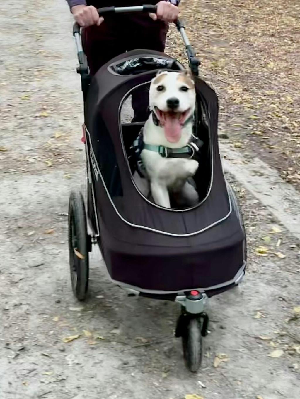 Our sweet girl has been blind for the past 5 years and now has arthritis. She is so determined, but we’ve found she can’t manage walks like she used to. We also have a 3 year old dog and it’s been really difficult to keep everyone happy. Having the stroller means Hetty can walk as far as she can, and be pushed when she’s had enough. It’s very easy to push with one hand when empty and lead her. I can see how much she is enjoying the smells and being outside when she is being pushed. I feel like we’ve got our girl back! She is a 13 kg Cairn Terrier and has plenty of room to stand or sit in the stroller. I think she could lie down, but it’s been too exciting so far! You can see more on Instagram @hettyandalbie