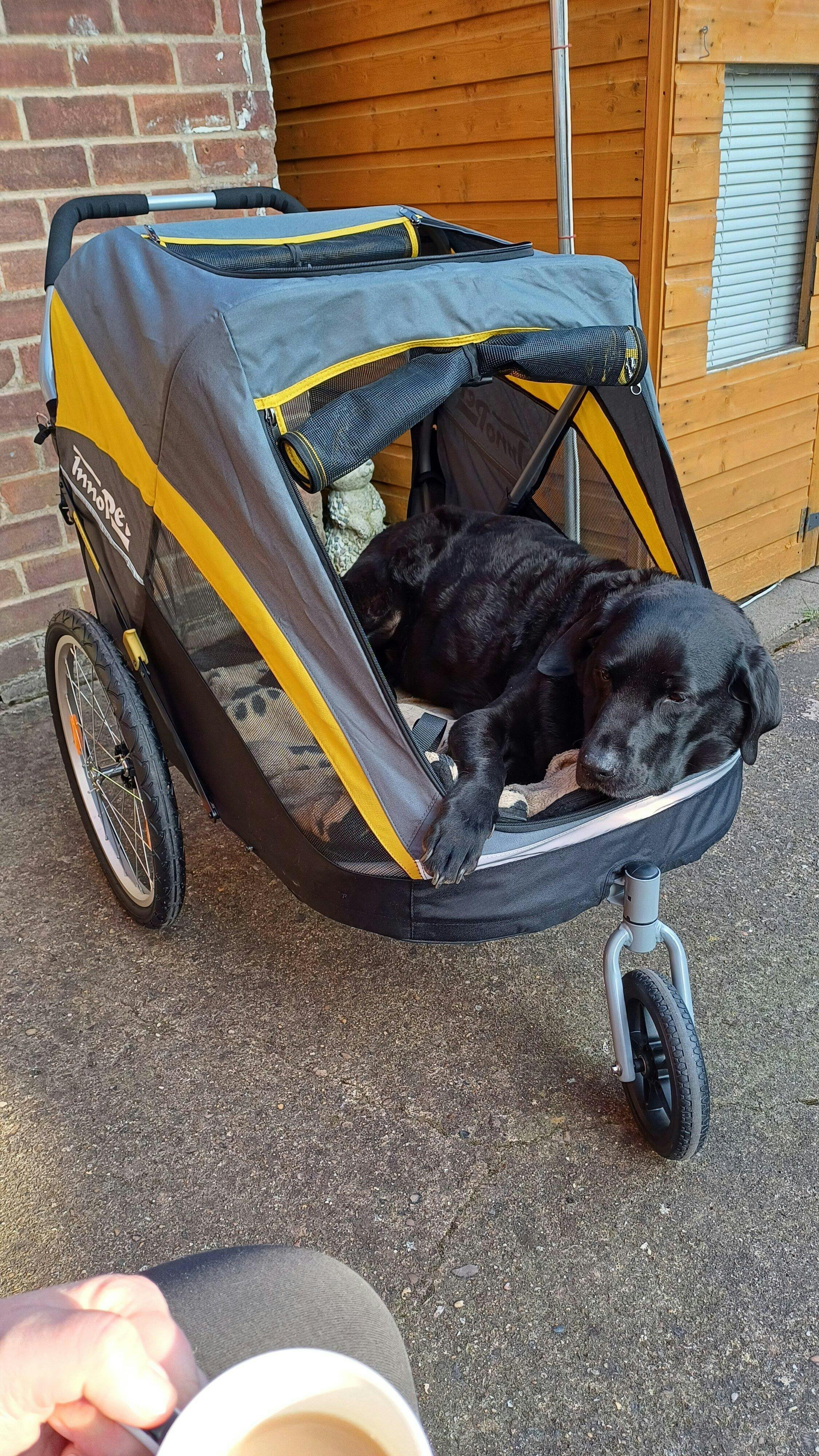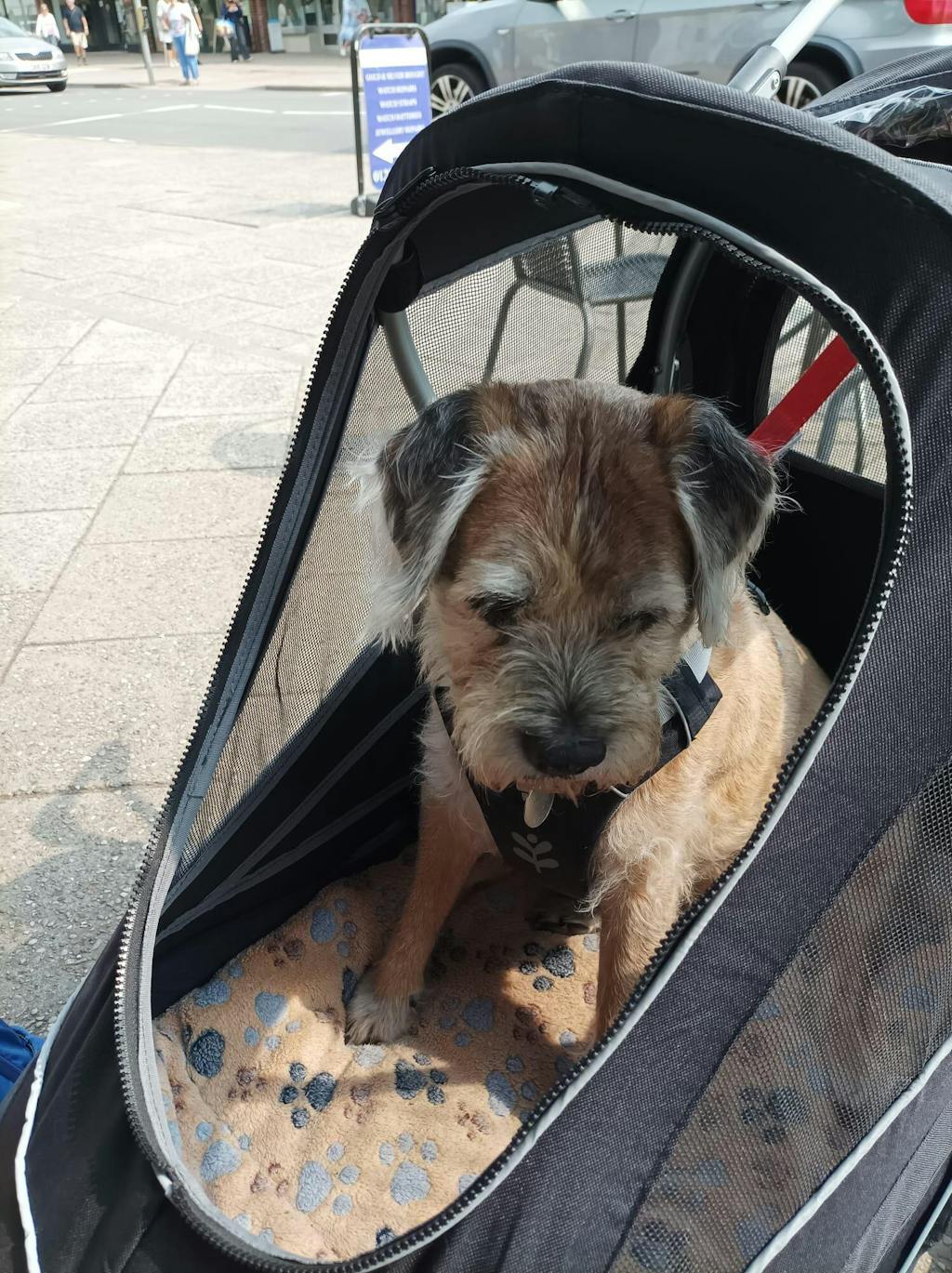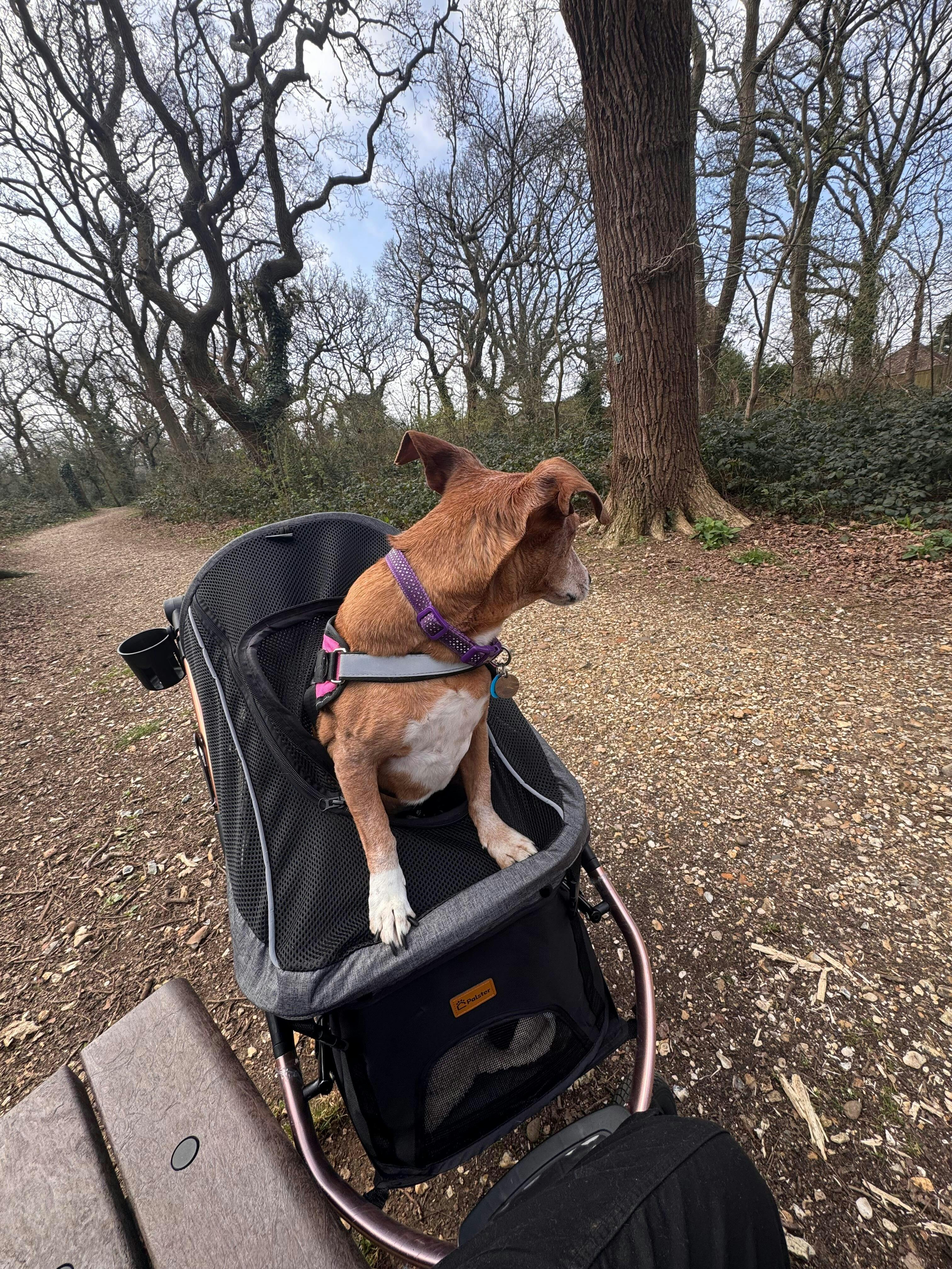 I have an ageing 16.5 yr old dog who loves to get out and about with me, but can’t always manage it, or if she does, walks at a snails pace 🤣