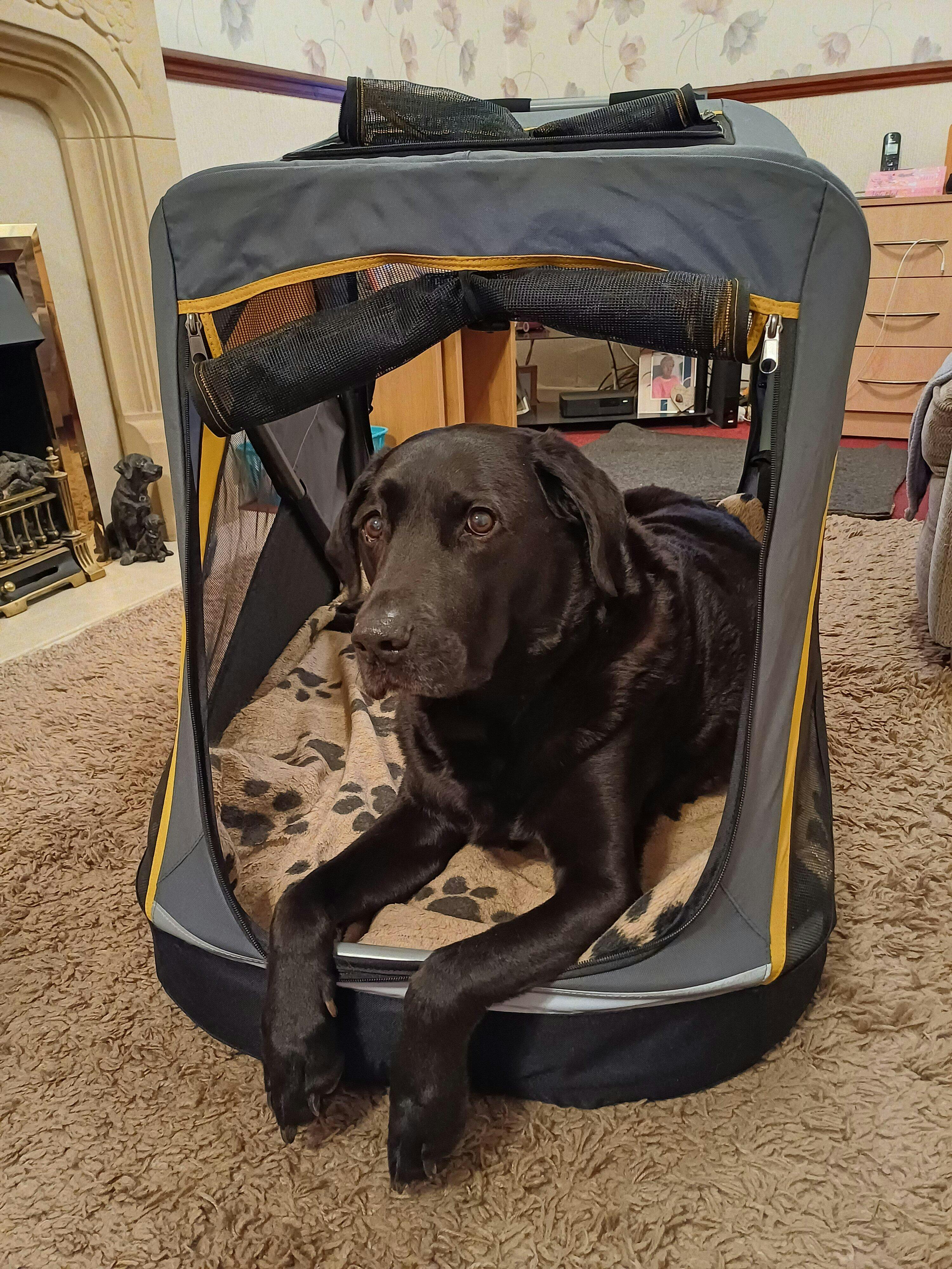 Dad laughed when Mum said she was getting this for us saying I would never get in it. When it arrived, I went in, treats induced of course, I was just about fit in. Phew, thought Mum.