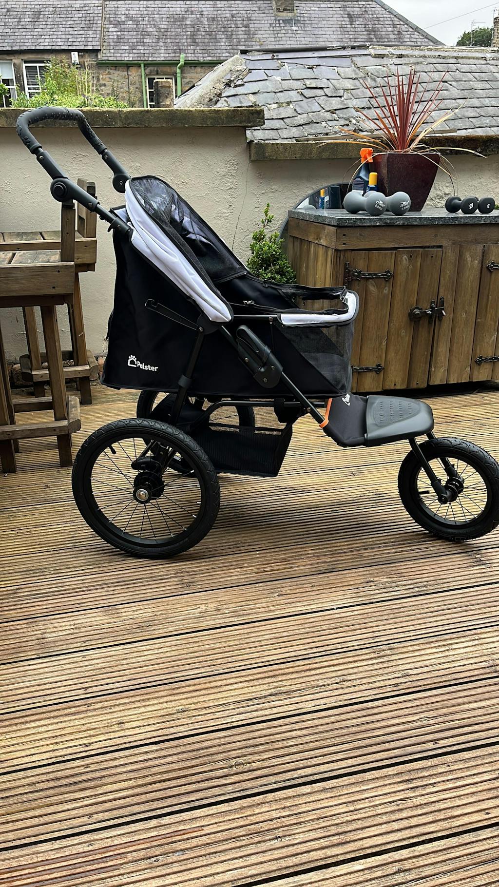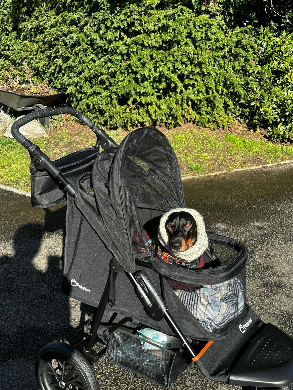 I chose the Palster Explorer because I wanted an all terrain buggy that was not too heavy (10.3kg) and not too large. It’s a fairly tight fit for Whisky (13kg) and she hasn’t tried lying down in it, but for sitting up it’s perfect. She is actually very calm and engaged with her surroundings when in it.