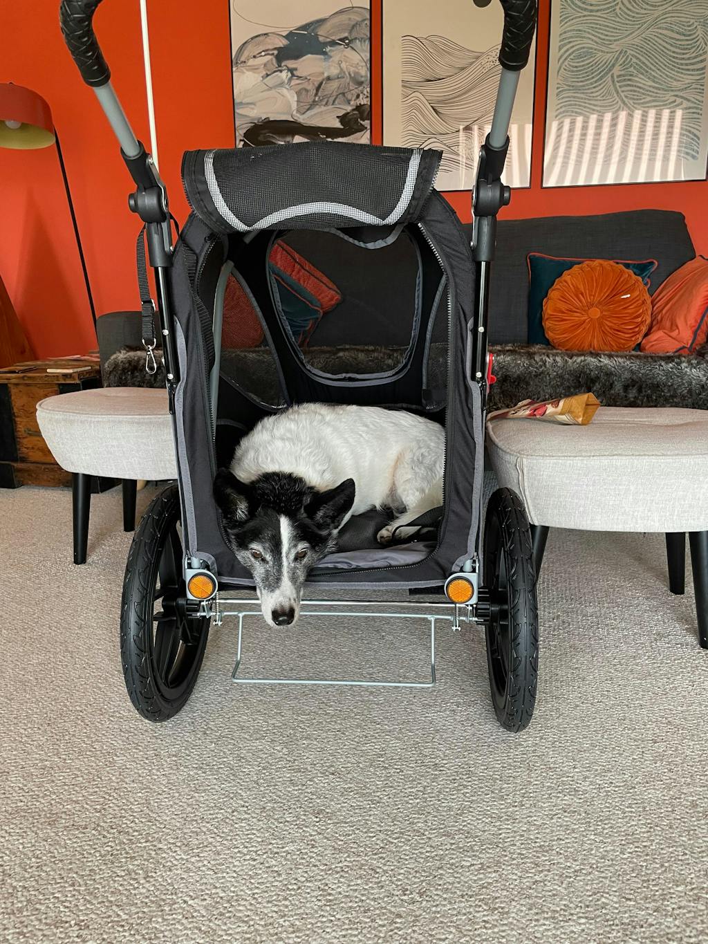 Our dog is reactive to people and also struggles to tolerate being picked up so the buggy suits her well because she can jump in herself. So far I’ve just got her eating her meals in the buggy, snuffle games and I reckon she will take to it! So far so good. I just can’t wait for the doors it will open in her life! She can be more involved with our day to day lives having this secure, safe, den on wheels along side. The buggy will help with tubes/ public transport as well and so her world can expand!