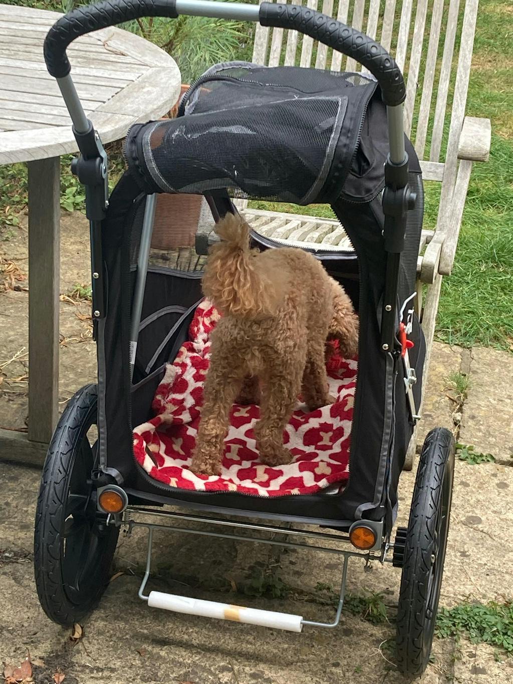 I ordered this because our elderly dog is starting to struggle even on short walks. It’s been great to be able to go on longer walks again with our younger dog while Alfie relaxes & takes in the view! It was simple to assemble and folds with ease to then go in the car. I’m so happy with my purchase.